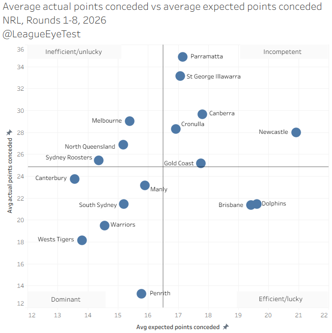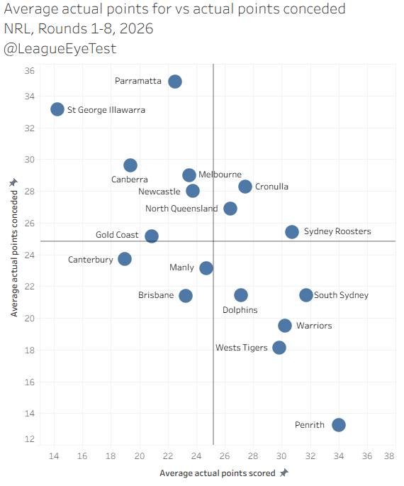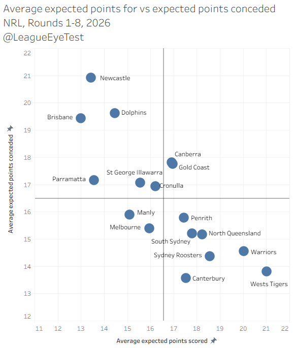 And then we have the inefficient/unlucky teams, with the Cowboys and Roosters joined by Melbourne. Like Penrith, Melbourne have never sat outside the Dominant quadrant after a full season, let alone eight games. That record looks like it will be broken this season.