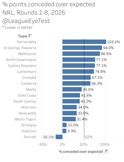 Parramatta are allowing triple digit scores above expected, which probably isn’t that bad given the injury crisis they’re suffering.