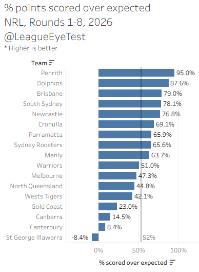 Penrith leads the way at +95% points over expected, which is very different to prior seasons. As noted last month, they’re scoring more long range tries than previous years, where they’d sit at low single digit positives here. They’re still potent when you give them too much ball, but they’re also lethal from long range now. Pick your poison.