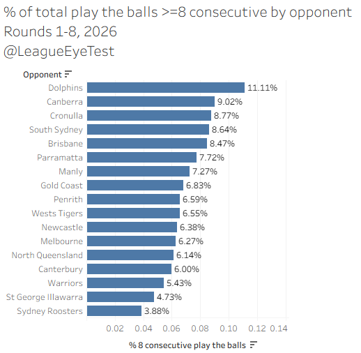 The issue is what I’ve noted previously this season, in that they cannot defend long strings of possession. I have Melbourne down for conceding 16 tries this season from at least eight consecutive play the balls, which is the highest in the NRL. Next closest are THE Dolphins at 12 and even Parramatta have only let in 11 of them. Cronulla is the only other team in double figures.
