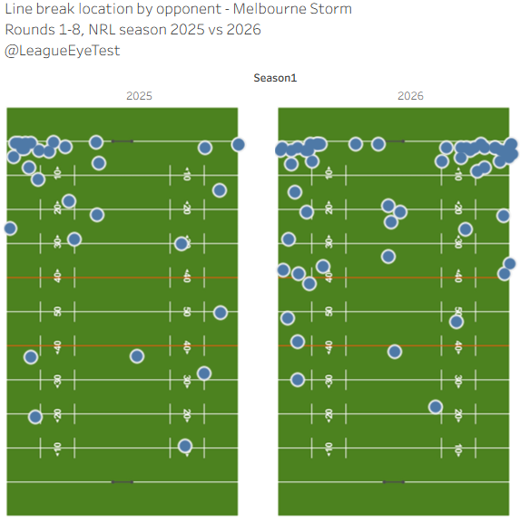 In the past two seasons, their left edge defensively had only allowed 16 line breaks. This year alone that has jumped to 25. In total their line breaks have almost doubled year on year, and are one fewer than 2024 & 2025 combined after eight rounds.