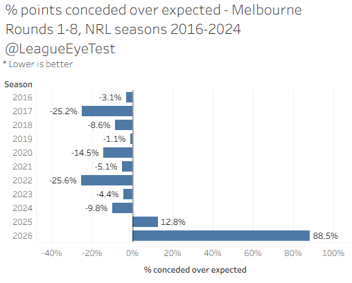 And here’s where the rot can bee seen for Melbourne. This year they are +88.5% in a metric where they’ve never been higher than 12.8% (2025) after eight rounds, and never higher than 30% in a full season (2020).