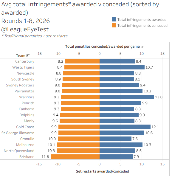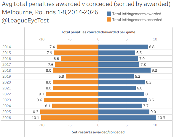 And Despite there being 50% more restarts this year, Melbourne are conceding fewer penalties and set restarts combined than last year, whilst receiving 1.3 more than they’re penalised for.