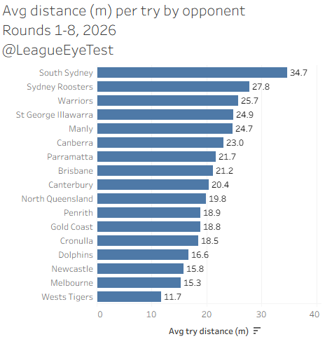 Even though there’s more line breaks coming from further away, the tries they’re allowing aren’t from long range. At just 15.3 metres per score they’re second best in the NRL, only below the Wests Tigers.