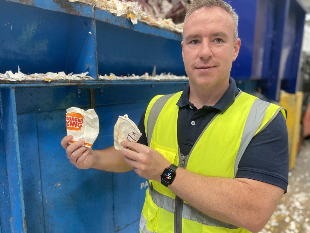 From cups to paper, Rob Tilsley shows some of the raw material used in the Cupcycling project.