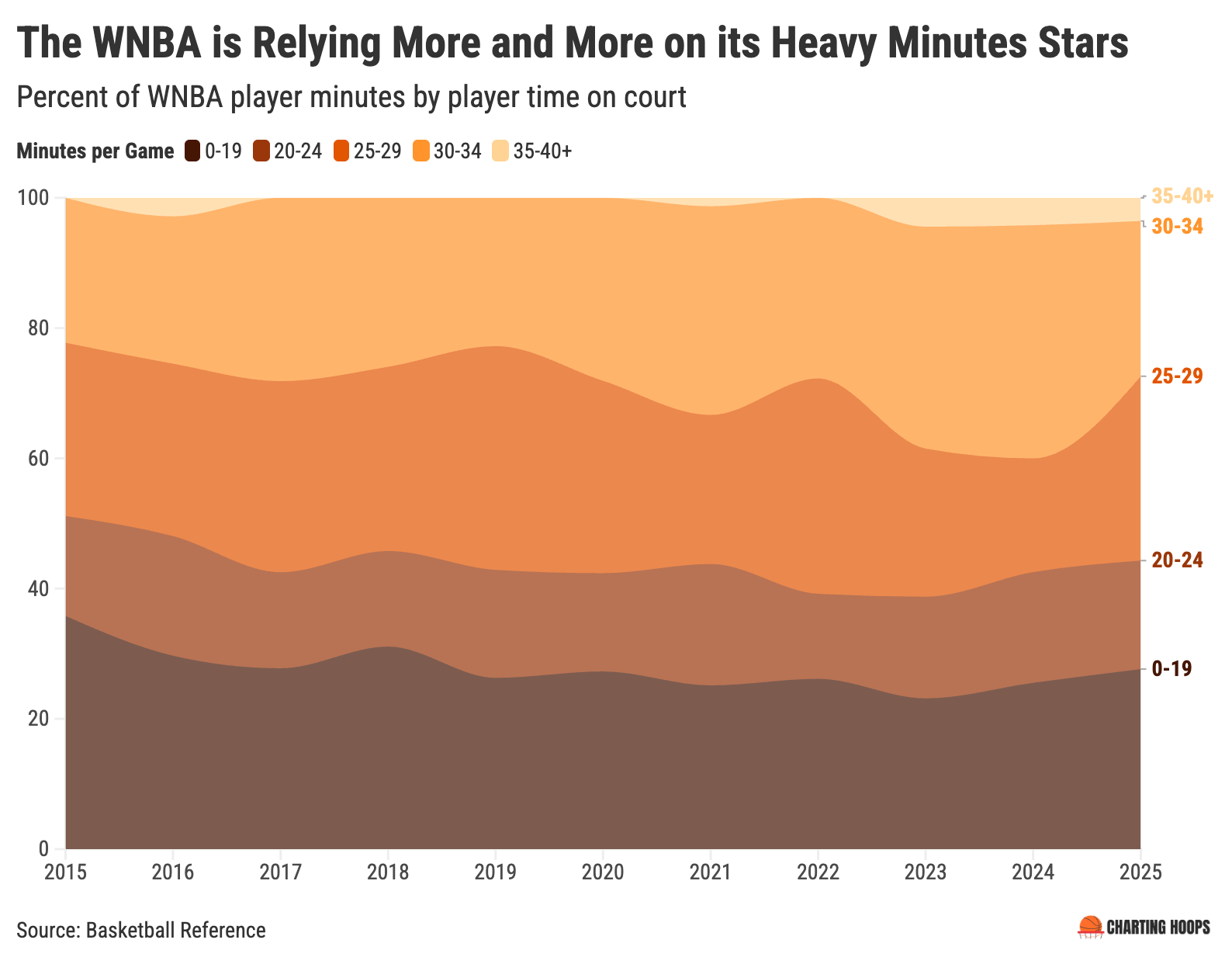 10 years ago, only a few stars played more than 30 minutes per game – they made up just 20% of overall minutes played in the league. Last season, that high-minutes player share has doubled, to more than 40%.