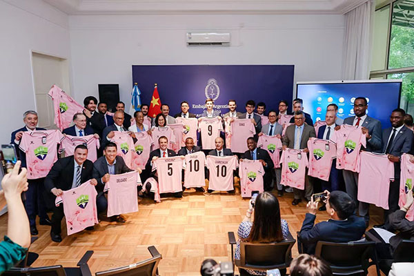 Diplomats recently gathered at the embassy of the Argentine Republic in Beijing to launch the second edition of the LAC UNITED soccer initiative, a project that brings together representatives from 15 Latin American and Caribbean embassies in China. [Photo provided to chinadaily.com.cn]
