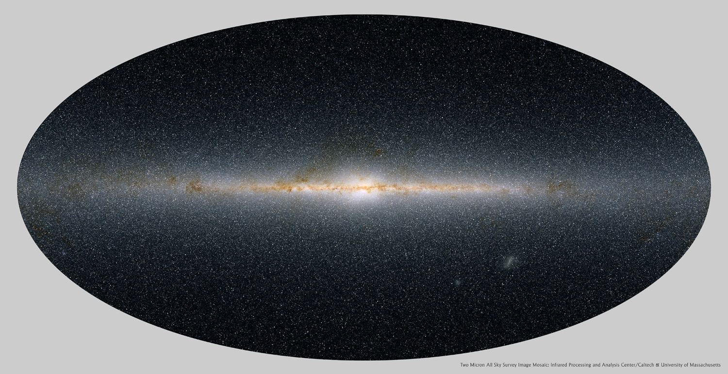 By viewing the Milky Way in infrared wavelengths of light, we can see through large amounts of the galactic dust and view the distribution of stars and star-forming regions behind them. As revealed by the 2 micron all-sky survey (2MASS), the densest collections of galactic dust can be seen tracing out our spiral arms, but the center of the plane of the Milky Way is where the dust is densest. Infrared and visible light views both showcase this, but in vastly different ways.