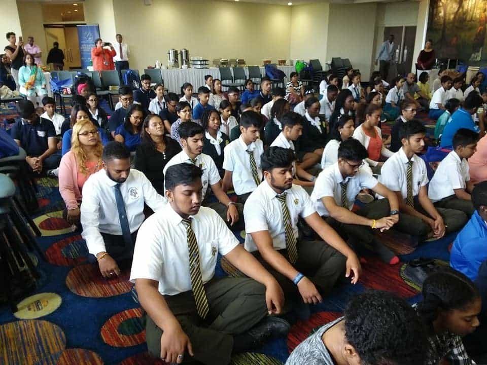 Local secondary school students being taught how to perform transcendental meditation by the Maharishi Institute of Science and Technology TT at a Vedic conference held at the Hilton Trinidad, Port of Spain, a few years ago. – Photo courtesy the Maharishi Institute of Science and Technology TT