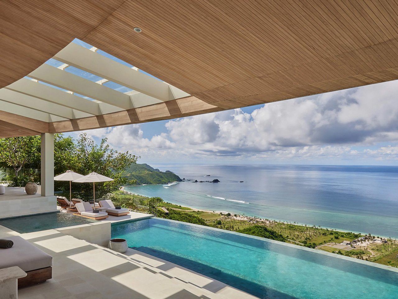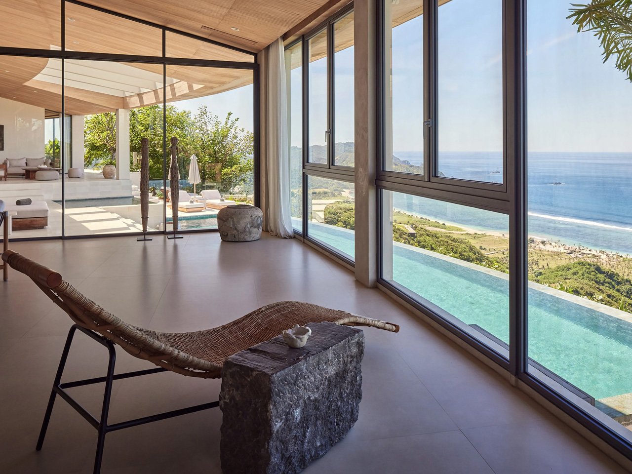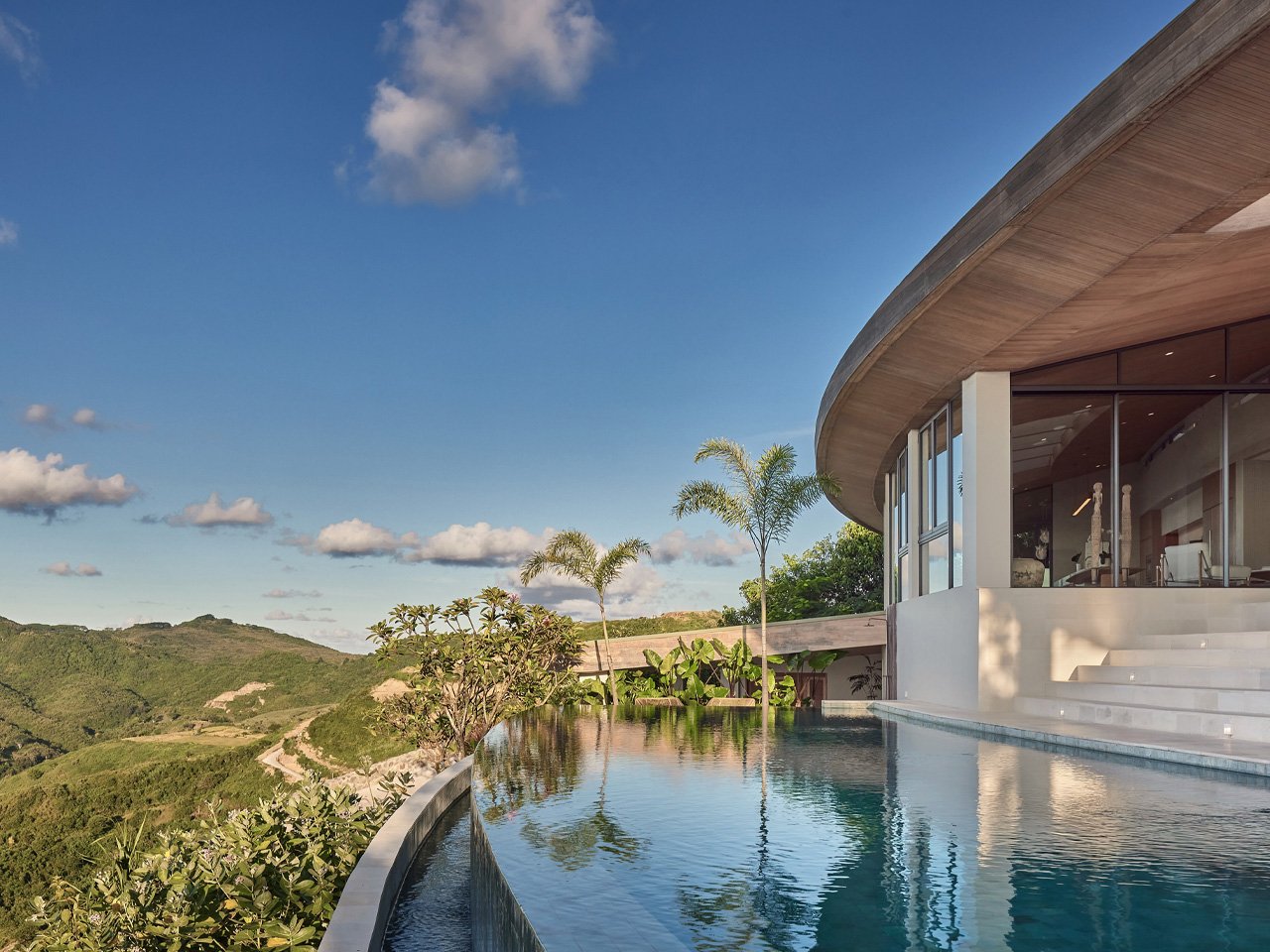 Materials tell the story of the place without trying too hard. Teak wood from local sources wraps the overhangs, while pale stone and white walls keep everything feeling cool under the tropical sun. The palette is restrained but warm, letting the dramatic setting do most of the talking. A swimming pool cuts across multiple levels, following the hillside’s contours instead of imposing a rigid rectangular shape.