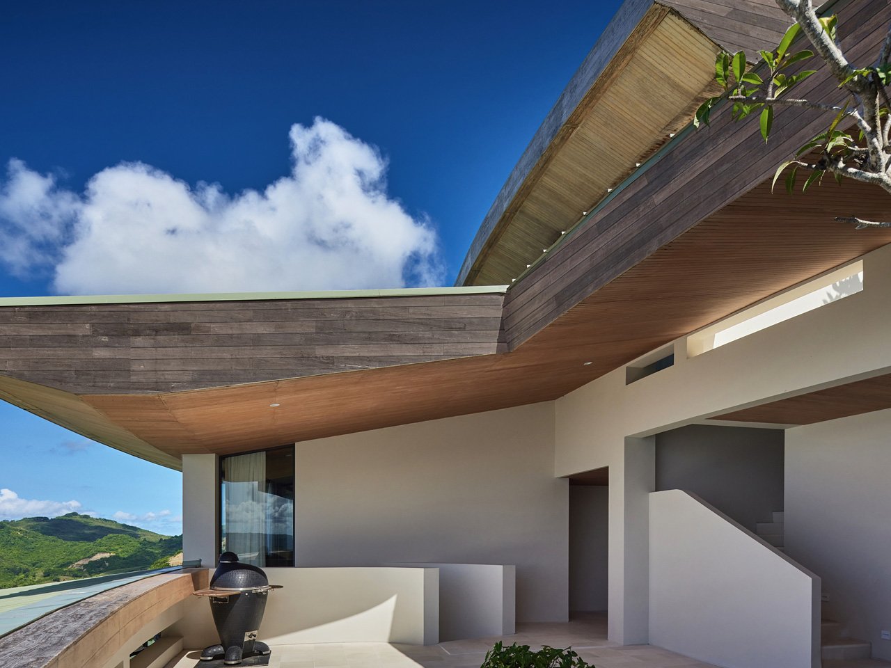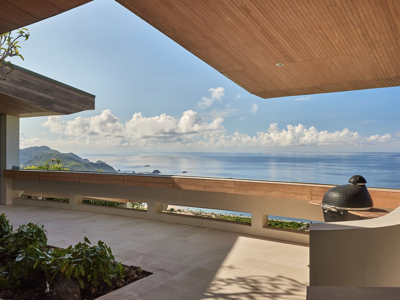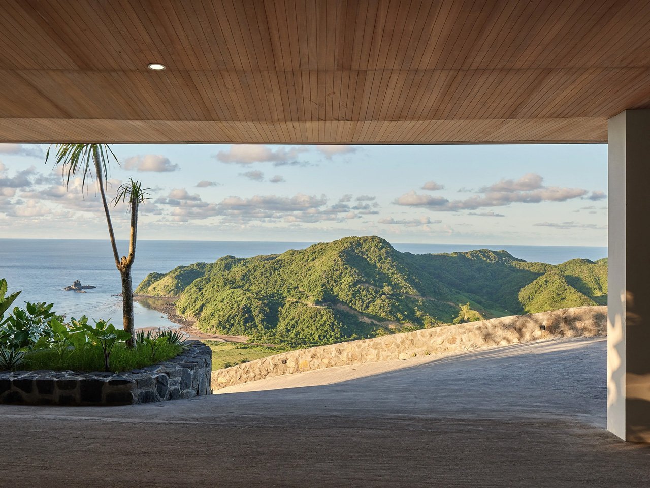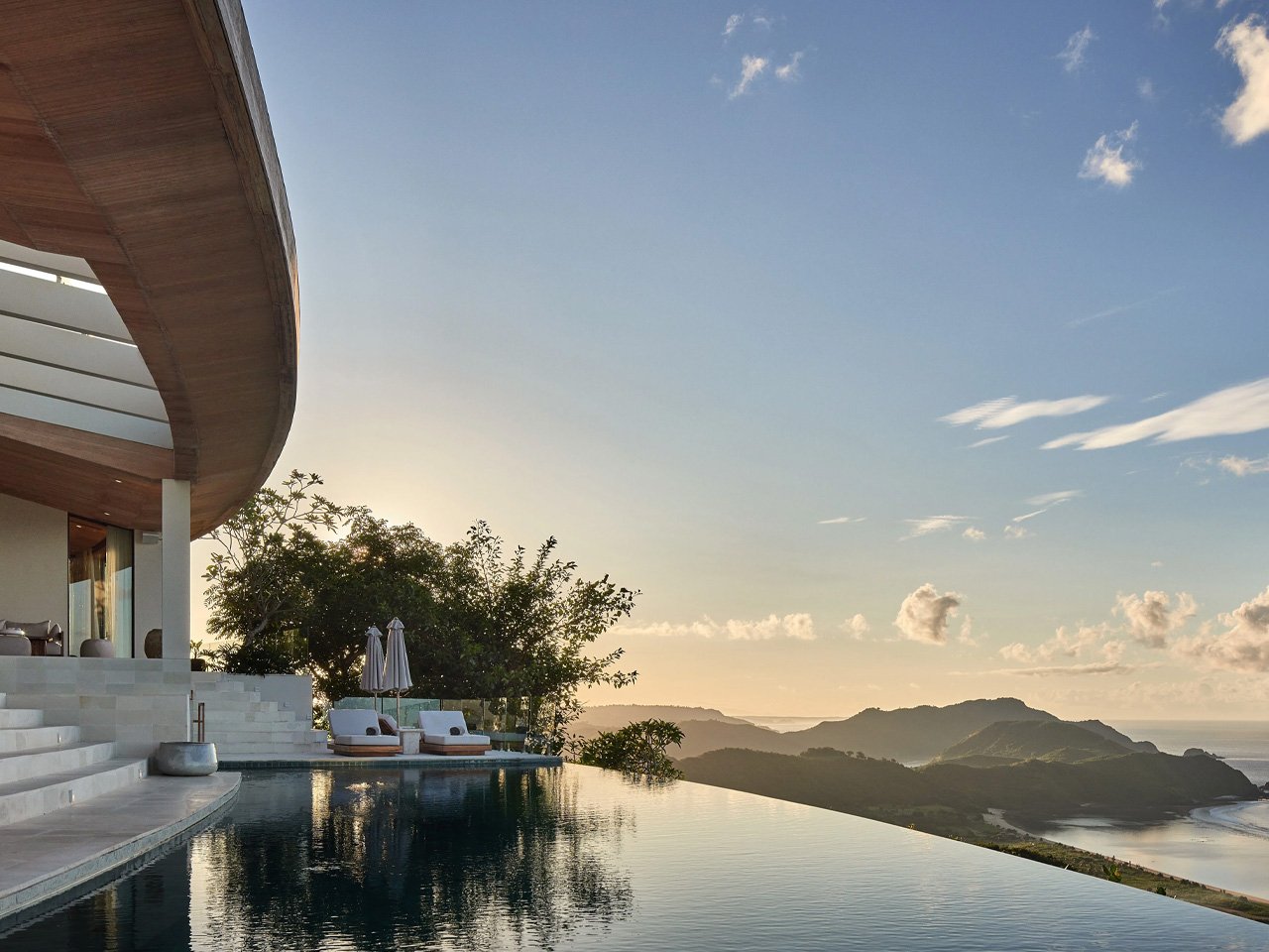 Materials tell the story of the place without trying too hard. Teak wood from local sources wraps the overhangs, while pale stone and white walls keep everything feeling cool under the tropical sun. The palette is restrained but warm, letting the dramatic setting do most of the talking. A swimming pool cuts across multiple levels, following the hillside’s contours instead of imposing a rigid rectangular shape.