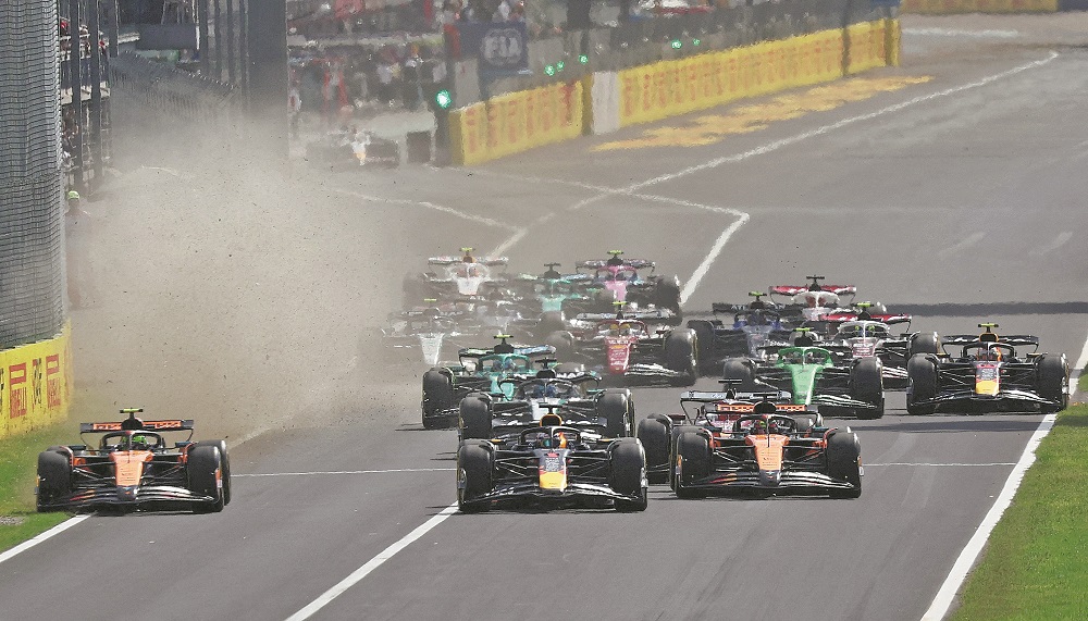 Red Bull”s Max Verstappen leads into the first corner just ahead of the two McLarens piloted by Lando Norris (left) and Oscar Piastri during the Formula One Italian Grand Prix at Autodromo Nazionale Monza in Monza, Italy, on Sept 7. REUTERS