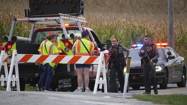 Officers were keeping people well back from the scene in the area’s rolling farmland, with some 30 police vehicles blocking off roads bordered by a barn, a goat farm and soybean and corn fields.