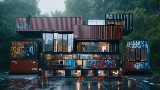 Stacked container building visualized with Veras, showcasing adaptive reuse and urban edge aesthetics.