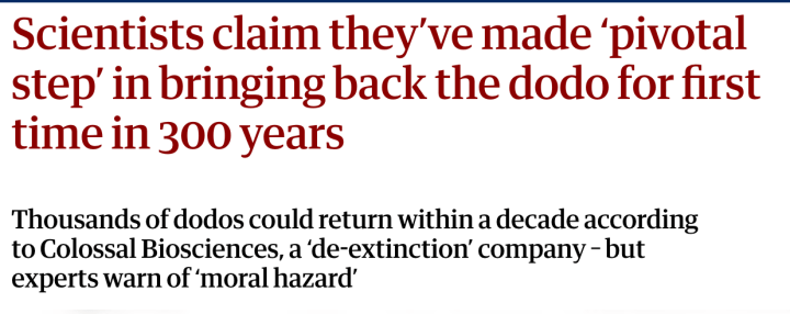 They have to make a LOT of dodos: at least a male and female to start out with. As the Guardian article just below notes (click to read), Colossal says they could put thousands of dodos in natural habitats within a decade, for repopulating the original habitat is the aim:”‘Rough ballpark, we think it’s still five to seven years out, but it’s not 20 years out,’ Ben Lamm, Colossal’s chief executive, said about the timeline for the dodo’s return. Colossal is working with wildlife groups to identify safe, rat-free sites in Mauritius where the species could once again roam. ‘Our goal [says Lamm] is to make enough dodos with enough genetic diversity engineered into them that we can put them back into the wild where they can truly thrive,’ he said. ‘So we’re not looking to make two dodos, we’re looking to make thousands’.”