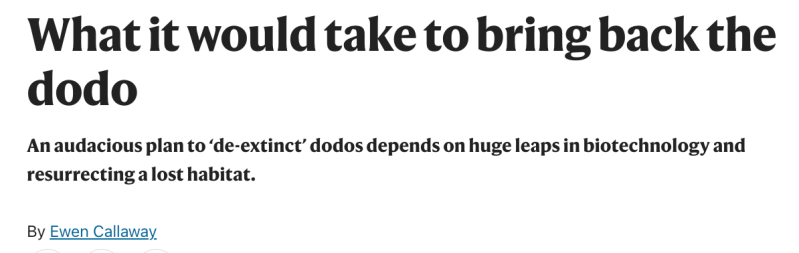 This news piece from Nature (click to read) describes not only Colossal’s method (see the Colossal dodo site here), but also describes the problems they face in creating a faux dodo (see the subtitle):