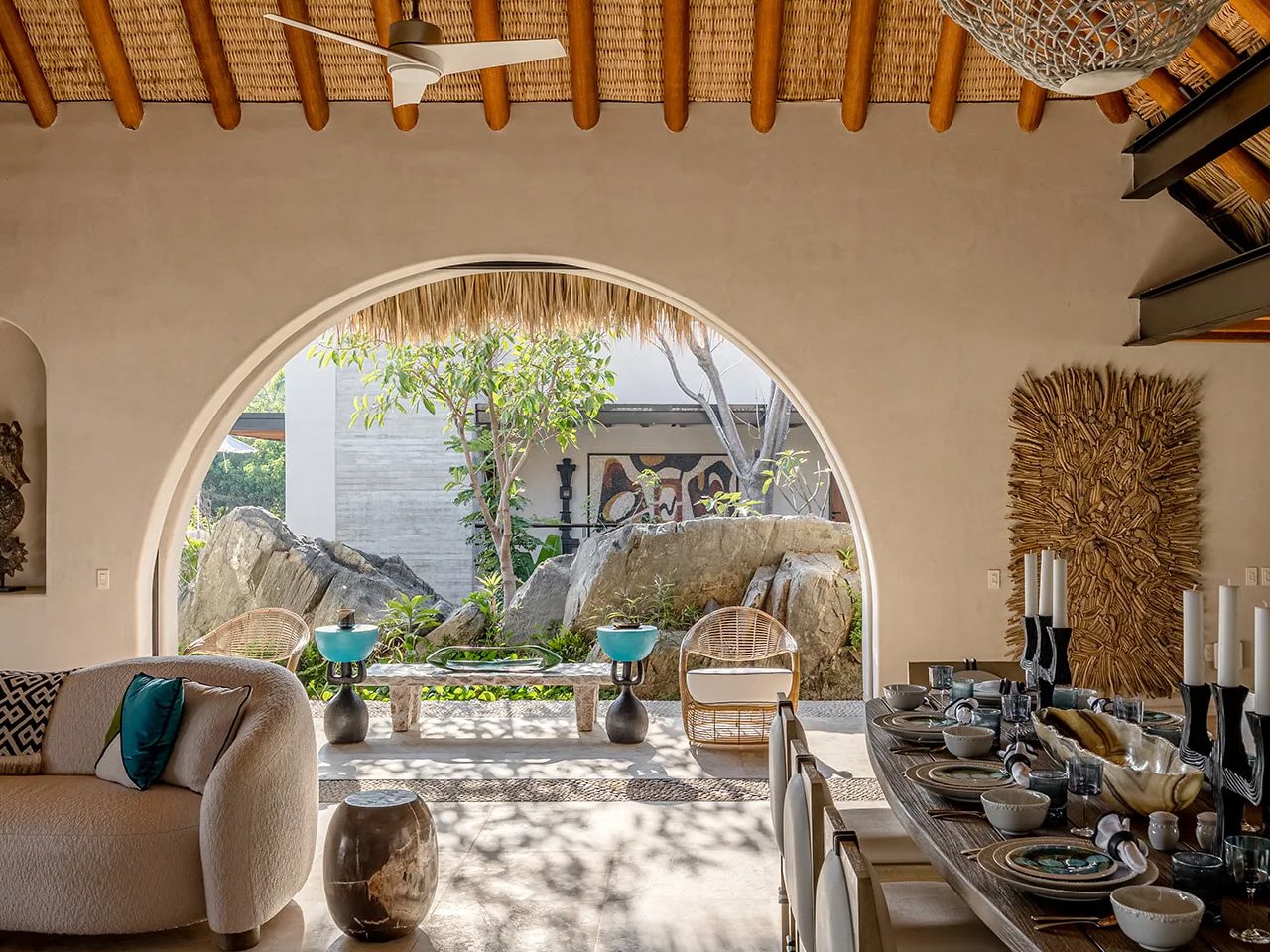 What immediately catches your eye is the massive palapa that crowns the residence. At 17 meters across, this traditional thatched-roof structure is the largest the firm has ever built for a private home. But this isn’t just about size—the palapa becomes the heart of daily life, creating a shaded outdoor room where the ocean breeze flows freely and the boundaries between inside and outside simply disappear. Under its soaring canopy, you’re simultaneously sheltered and completely connected to the sea.