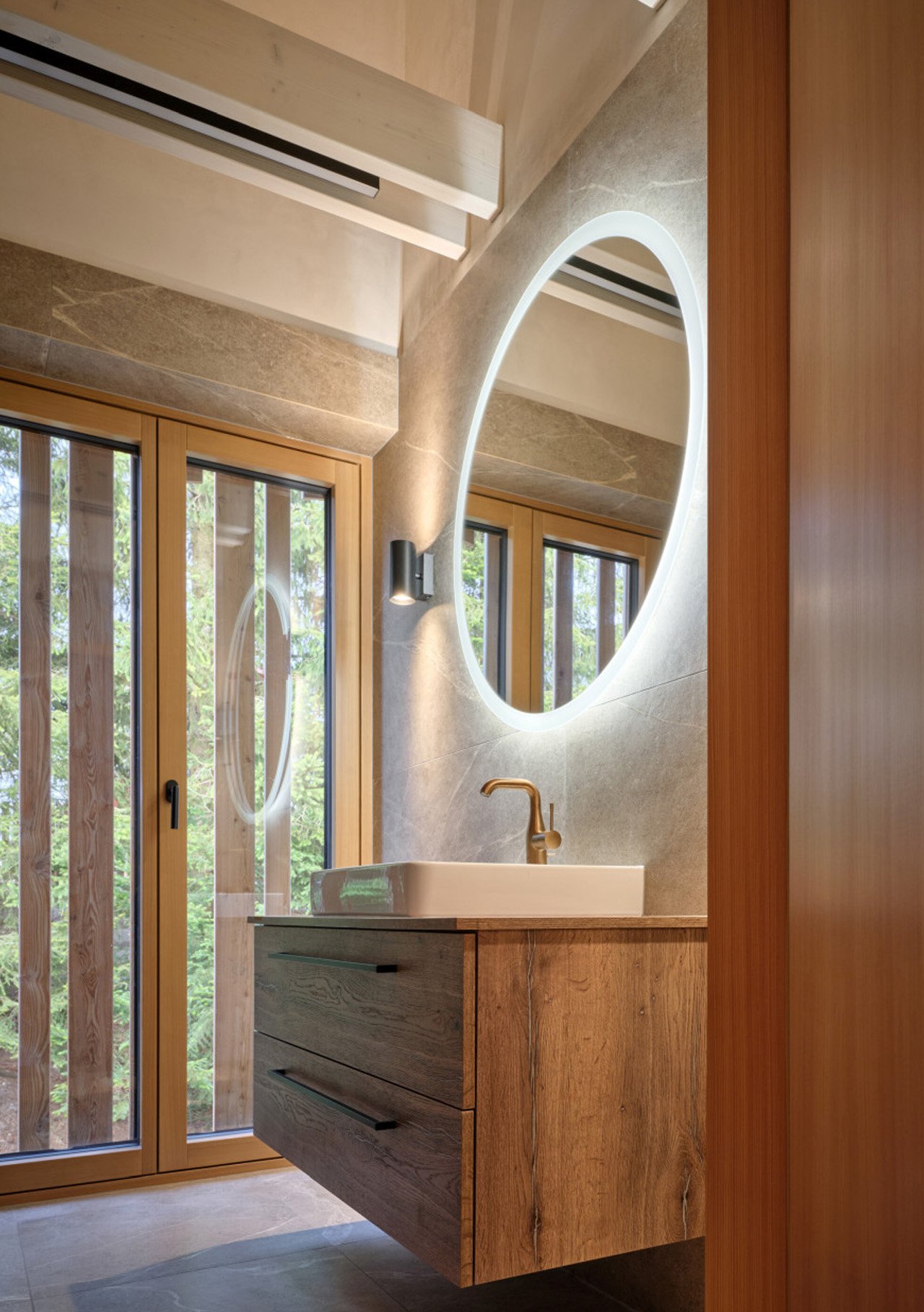 The interior layout makes clever use of the sloping site. There’s a wellness area tucked under the main level with a sauna and relaxation spaces that get natural light filtering down from above. All the boring mechanical stuff gets hidden away at this lower level, keeping the main living spaces focused on those mountain views.