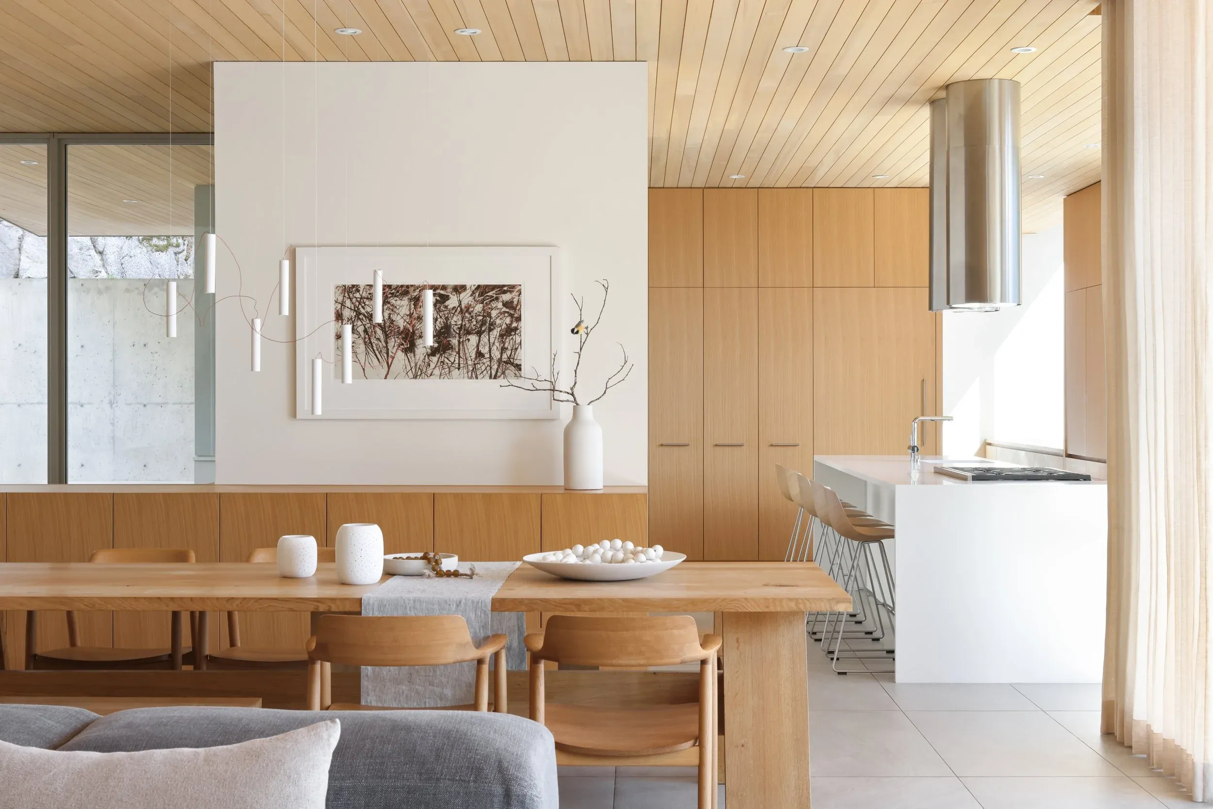 The Sanctuary’s kitchen and dining area feature custom wood cabinetry and minimalist design. (Ema Peter/West Coast Modern)