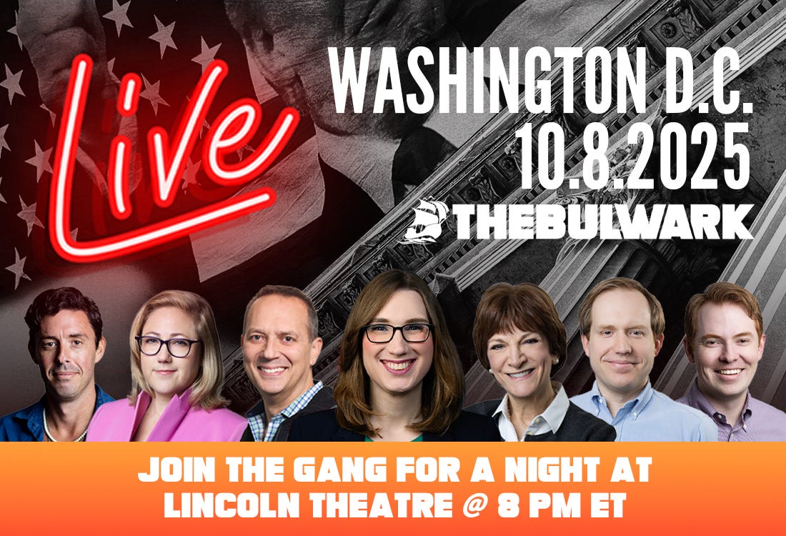 Just announced: Rep. Sarah McBride will join Sarah Longwell on stage at Bulwark Live in D.C. on Wednesday, October 8.Plus: Mona Charen, Will Sommer and Andrew Egger will join Sarah, Tim and JVL for a super-sized Bulwark Live experience.