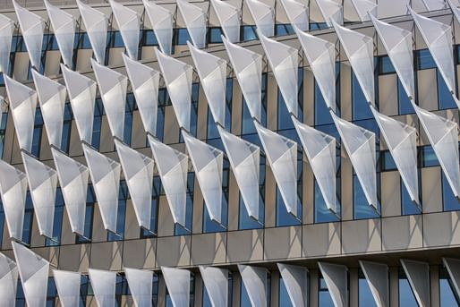 Mounted on a steel frame and fully recyclable, the sunshades reduce embodied carbon by 90 percent compared to conventional aluminum systems. The system diffuses daylight deep into the building while limiting solar gain, easing cooling demands.