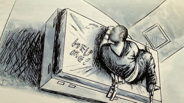 A drawing of a man laying down with a bag over his head, restrained to a bed, while people hold him down and touch his abdomen.The report included an artist’s rendition of a patient being assaulted while restrained in a seclusion room at the Restigouche Hospital Centre. (Submitted by New Brunswick Ombud)