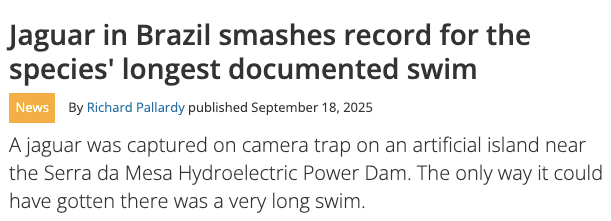 A jaguar in Brazil has been documented making a record-breaking swim of up to 1.54 miles (2.48 kilometers). This distance is far beyond the previous verified record of around 650 feet (200 meters) for jaguars, according to the study authors.