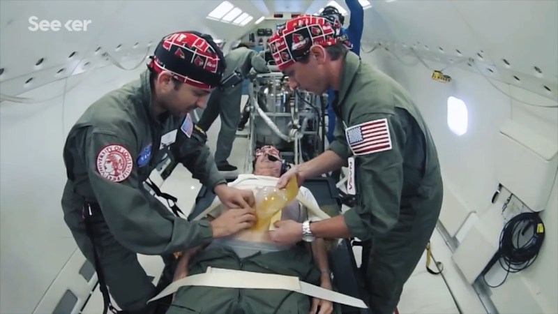 Simulating space surgery aboard NASA’s “Vomit Comet.” This study from the University of Kentucky Louisville aims to develop tools and techniques to make space surgery possible. Source: Seeker