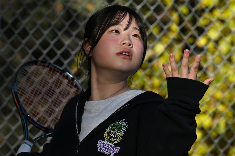 Junior exchange student Noa Kawashima from Nagasaki, Japan practices serves during tennis practice at Bartlett High School on Tuesday, Sept. 30, 2025. (Bill Roth / ADN)