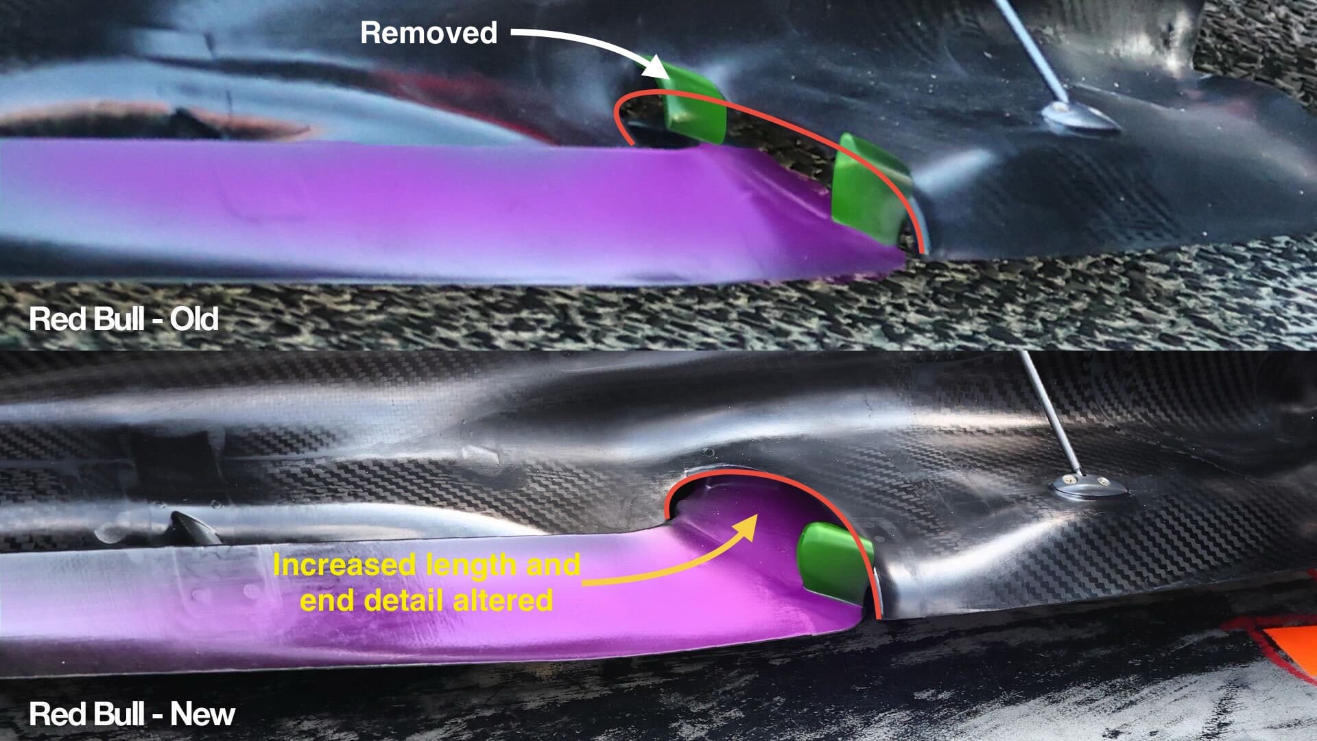 The front wing is a new package, described by the team as featuring “locally increased cambers to extract more load”. It’s difficult to pick up those subtle profile changes, but what is very clear is that Red Bull has moved the two slot gap separators that I have highlighted with the red ellipses further outboard.