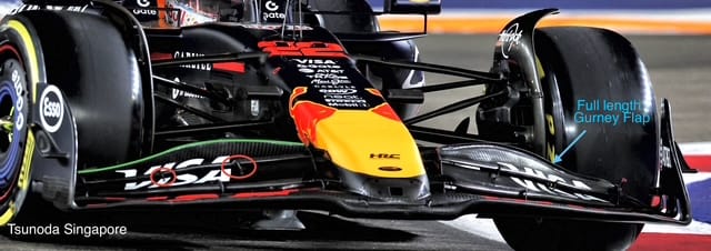 At Monza and Baku, Red Bull ran a front wing assembly derived from the same rear flap trim line. This meant the flow to the underfloor stayed reasonably consistent.