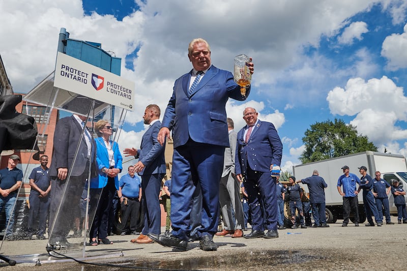 Ontario Premier Doug Ford empties a Crown Royal bottle of whisky at a press conference in Kitchener, Ont., on Tuesday, Sept. 2, 2025. THE CANADIAN PRESS/Sammy Kogan Ontario Premier Doug Ford empties a Crown Royal bottle of whisky at a press conference in Kitchener, Ont., on Tuesday, Sept. 2, 2025. Ford criticized the popular whisky’s parent company, Diageo, for their plan to close one of their Ontario bottling plants in the coming months. THE CANADIAN PRESS/Sammy Kogan (Sammy Kogan/The Canadian Press)