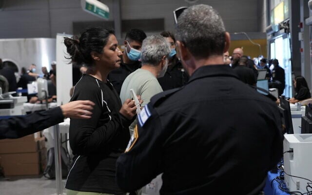 This handout photo from police shows anti-Israel activists from the Global Sumud Flotilla being processed after they were detained while trying to break Israel’s maritime blockade on Hamas-ruled Gaza, October 2, 2025. (Israel Police)