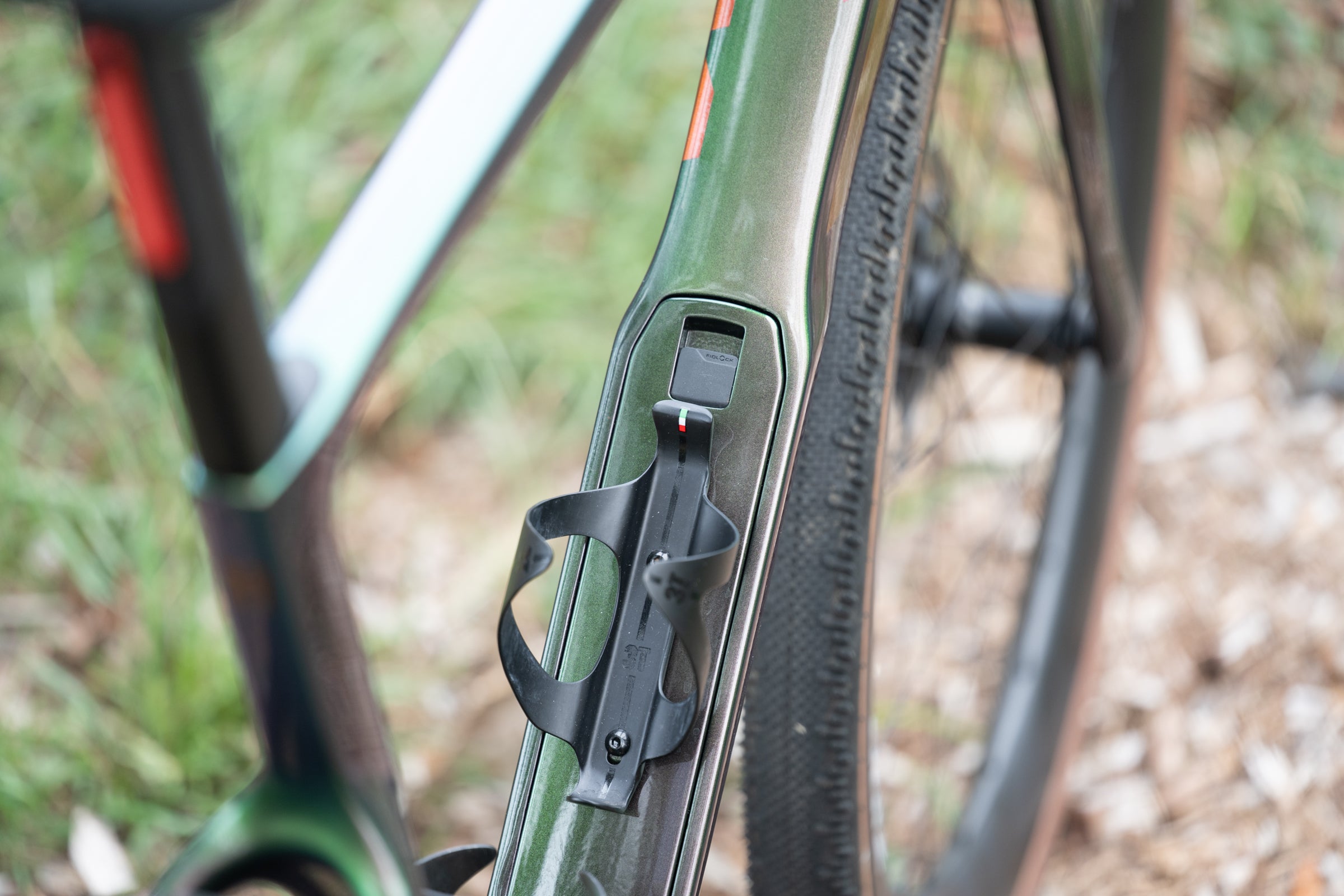 What’s changed is that there’s now integrated downtube storage in this massive tube. Opening it is simple with a Fidlock branded “mini-hook closure” that amounts to a pull down to a simple pull tab. Inside is a dedicated bag made by Missgrape. There’s also still two bottle mount locations on the downtube, even with the storage.