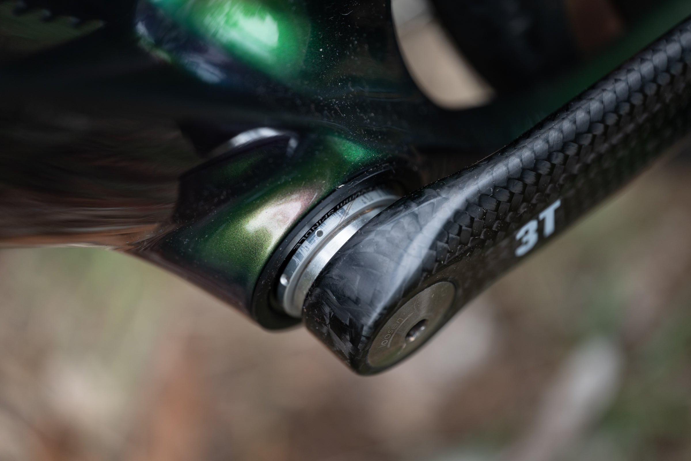 Above the downtube you’ll also see an update to the headtube. 3T doesn’t give the exact numbers behind this but the narrower neck area of the downtube is 54mm and there’s a “minimalist Fango Racemax 2 Crown” at the top of the fork that further helps with the aero optimization. Fortunately along with these changes the headset bearings have actually grown in size a bit up to a CeramicSpeed IS44/52 compared to the previous IS42/52.