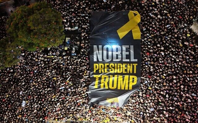 Crowds in Tel Aviv’s Hostages Square carry a banner, “Nobel President Trump,” on October 11, 2025. (Amir Goldstein / Hostages Families Forum.)