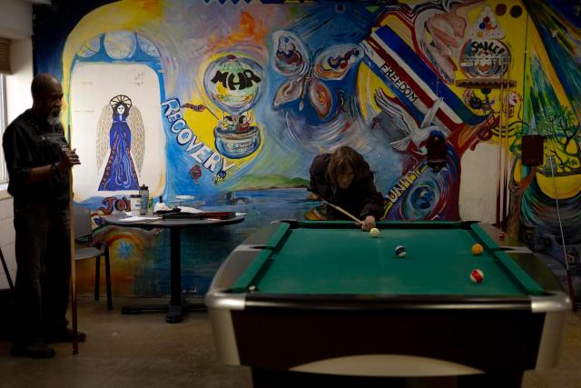 Members play pool in front of a mural made by a former member at Seward Community Support Program and Drop-In Center on Friday, Oct. 10, 2025, in Minneapolis, Minn. Credit: Ellen Schmidt/MinnPost/CatchLight Local/Report for America