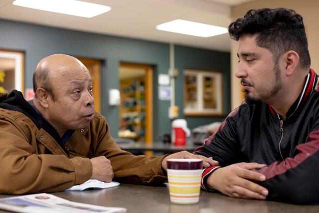 Adan Mendoza Pacheco, left, and Franklin Pereira-Soto chat over coffee at Seward Community Support Program and Drop-In Center on Friday, Oct. 10, 2025, in Minneapolis, Minn. Credit: Ellen Schmidt/MinnPost/CatchLight Local/Report for America