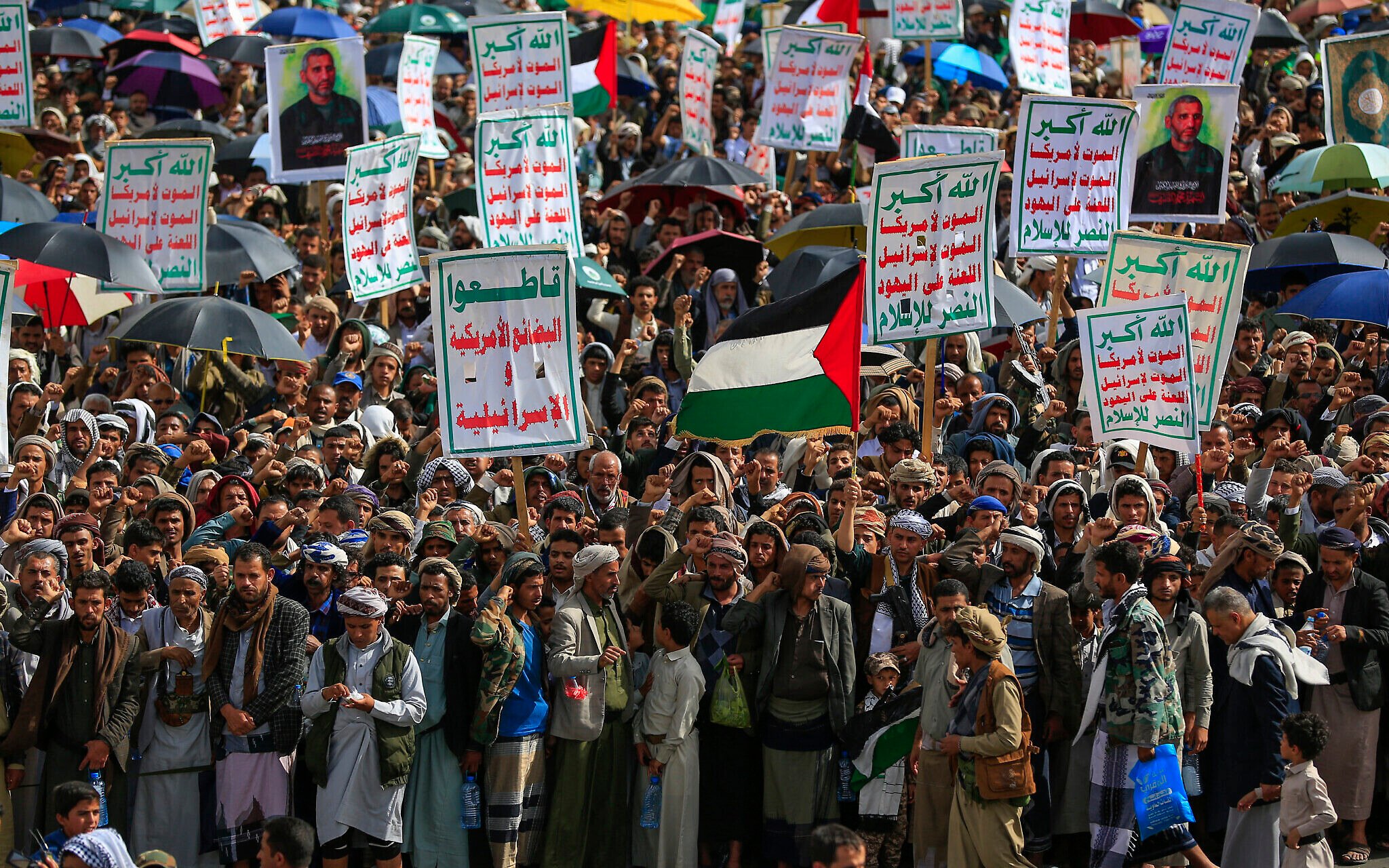 Yemenis lift placards and Palestinian flags during a rally against Israel and the United States, in the Houthi-run capital Sanaa on July 18, 2025. (Mohammed Huwais/AFP)