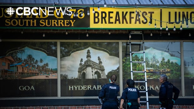 Police investigate at Surrey’s Kap’s Cafe, which is owned by Indian comedian Kapil Sharma, on Oct. 16, 2025. (Ethan Cairns/CBC)