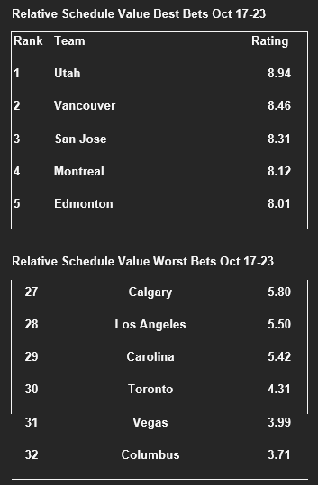 *Note: This week’s analysis runs from October 17-23. The weekly Fantasy Matchup runs from Oct 20-26. Teams that play more games during the week/matchup often gain favor in the schedule analysis.