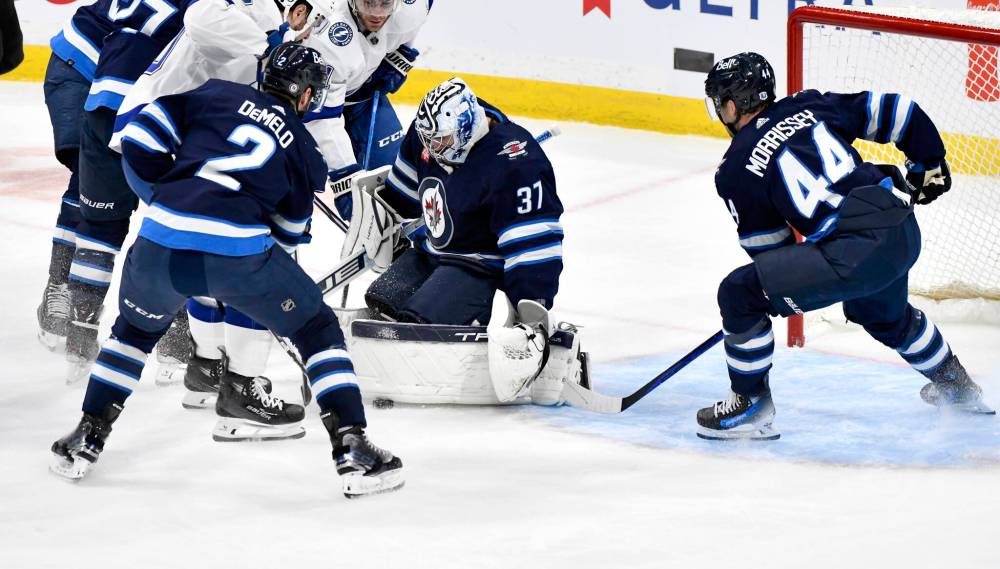 DeMelo and defence partner Josh Morrissey, right, watch as Jets’ goaltender Connor Hellebuyck makes a save.