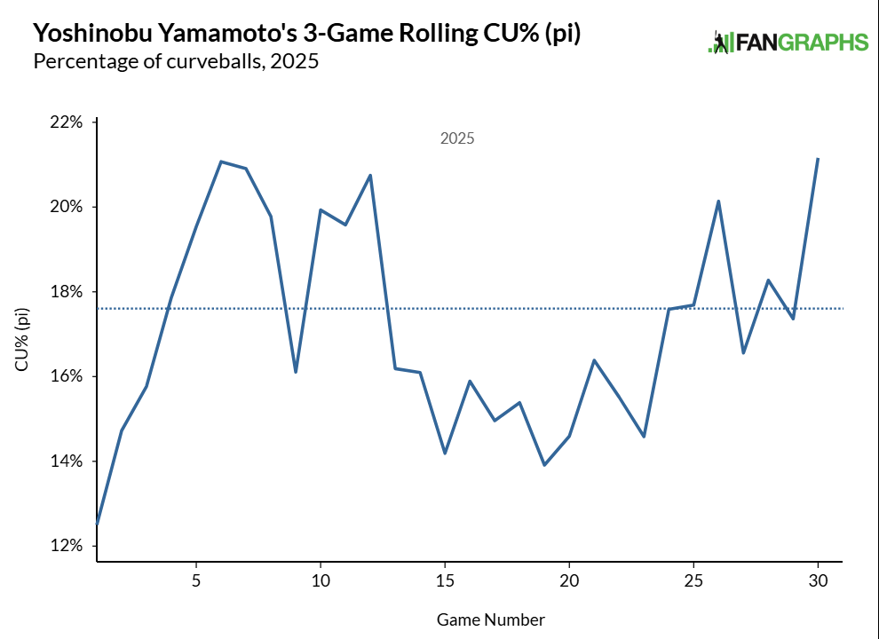 That pitch has been particularly tough for hitters lately. They’re slugging .081 against it since the beginning of September with 15 strikeouts. Yamamoto has increased its usage accordingly. His playoff curveball rate (24.7 per cent) is higher than any three-game stretch during the regular season.