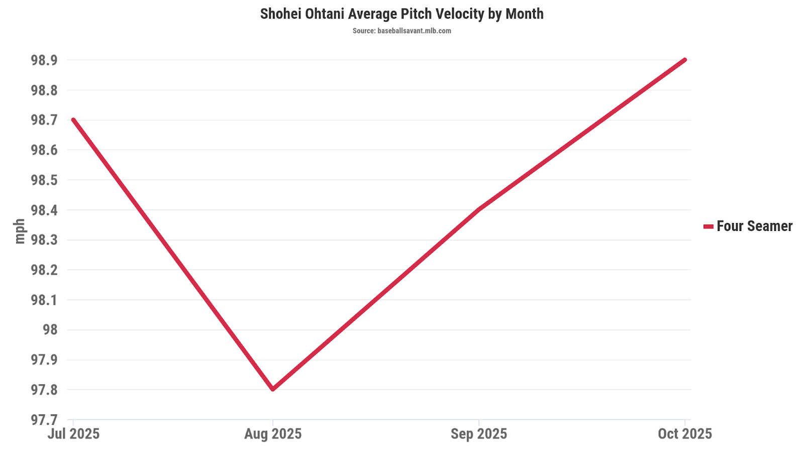 That graph undersells the increase with his July velocity reading coming from three short-stint outings that spanned four total innings. The velocity he’s working with now as a traditional starter is truly elite. Only two starters topped Ohtani’s current 98.9 m.p.h. during the regular season: Hunter Greene (99.5 m.p.h.) and Jacob Misiorowski (99.3 m.p.h.).
