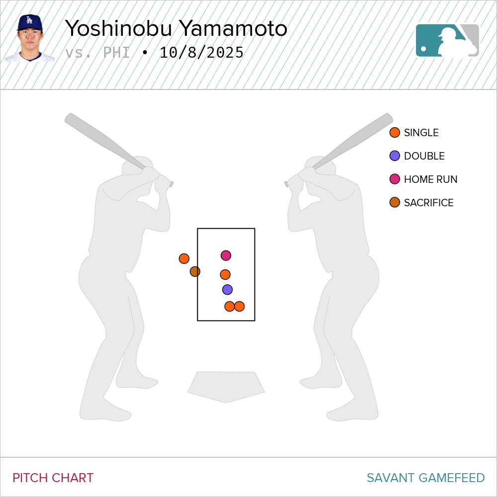 The best method for getting to the right-hander might be waiting on his fastball. It is his most commonly used pitch, and while its velocity has been good in the playoffs, it doesn’t have many other special qualities. Yamamoto’s heater has approximately average movement and limited spin, and his 52nd percentile extension doesn’t give it much added juice. Stuff+ rates the pitch as a well below-average 91 in his career, although his recent improved velocity and strong location undoubtedly help its effectiveness at this moment.