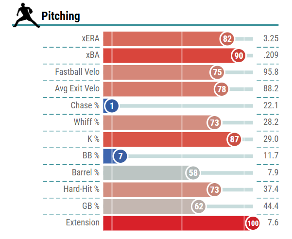 Glasnow’s percentile ranks are well above average in nearly every category except throwing pitches outside the zone that hitters don’t offer at, which leads to plenty of walks.
