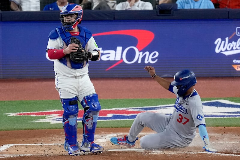 Hernández slides home for first run of the game Los Angeles Dodgers’ Teoscar Hernández (37) scores on a base hit by Kiké Hernández as Toronto Blue Jays’ Alejandro Kirk looks on during the second inning in Game 1 of baseball’s World Series, Friday, Oct. 24, 2025, in Toronto. (David J. Phillip/AP) Bichette hits a single in first postseason at-bat since injury Toronto Blue Jays’ Bo Bichette hits a single during of first inning Game 1 World Series playoff MLB baseball action against the Los Angeles Dodgers in Toronto on Friday, October 24, 2025. (Frank Gunn/The Canadian Press)