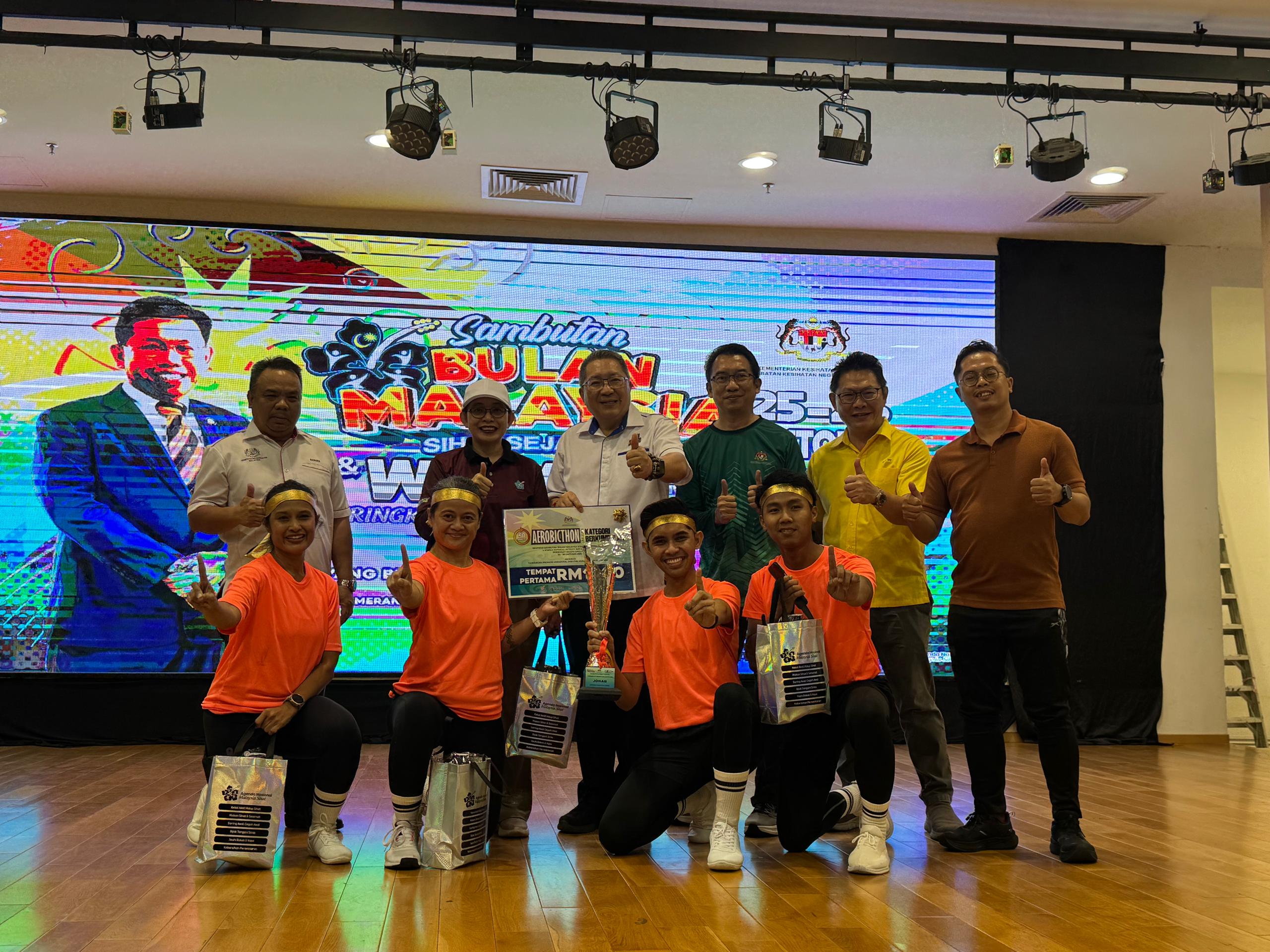 Dr Veronica (second left) and Wee on her left join the group champion of the aerobicthon for a photo call during the state-level celebration of BMSS and WoPAD 2025 held at a shopping mall in Petra Jaya today.