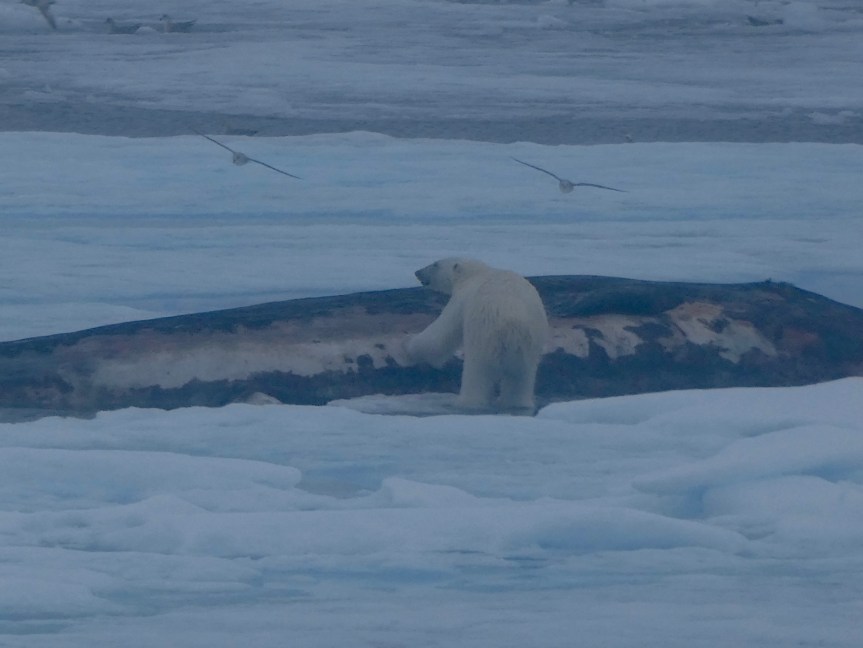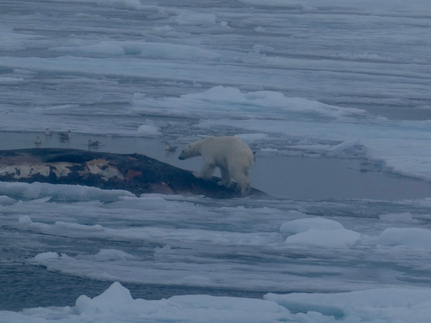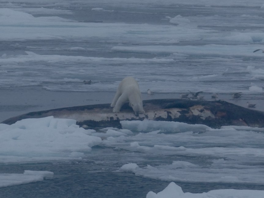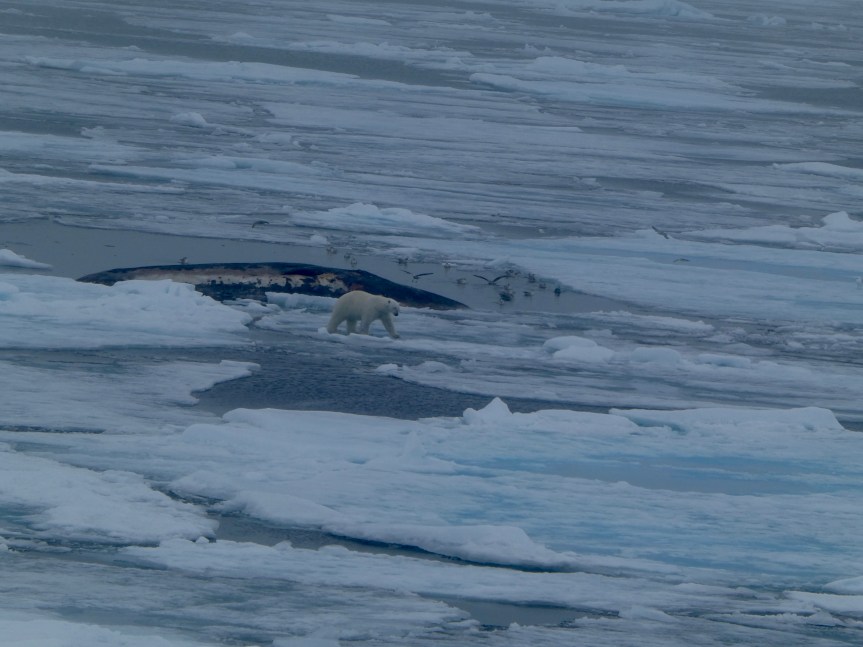Don’t ask me how a dead whale got on an ice floe rather than sinking in the sea. This sight alone was, to me, worth the price of the trip. But there was of course a lot more, which I’ll post in the coming weeks. These, though, are my favorite photos. Even an expert polar photographer doesn’t come across situations like this. (Click ’em to enlarge.)