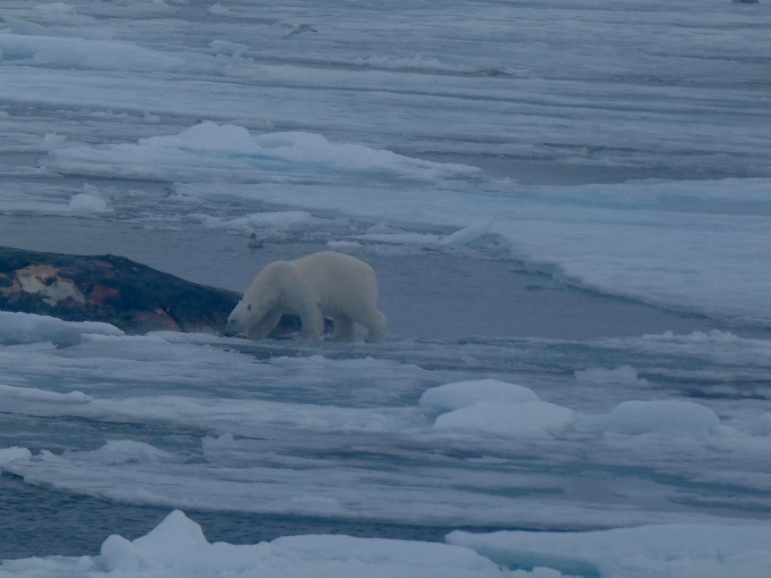 This photo series, one or two I showed before at much lower resolution, comprises two of these elements: a polar bear and a whale, identified by our whale experts as a sperm whale (I can’t verify this). Near the northernmost part of our trip, at roughly 83º north latitude (a record for the ship itself and everybody on it), we saw an amazing sight: a polar bear (Ursus maritimus) gobbling down the blubber of a dead sperm whale (Physeter macrocephalus) on top of an ice floe. So here you see the world’s largest terrestrial predator gnawing on the world’s largest marine predator. It is a rarity, as both animals are scarce, and to see them together raised the hair on my neck. It was so amazing! Here are a few shots: